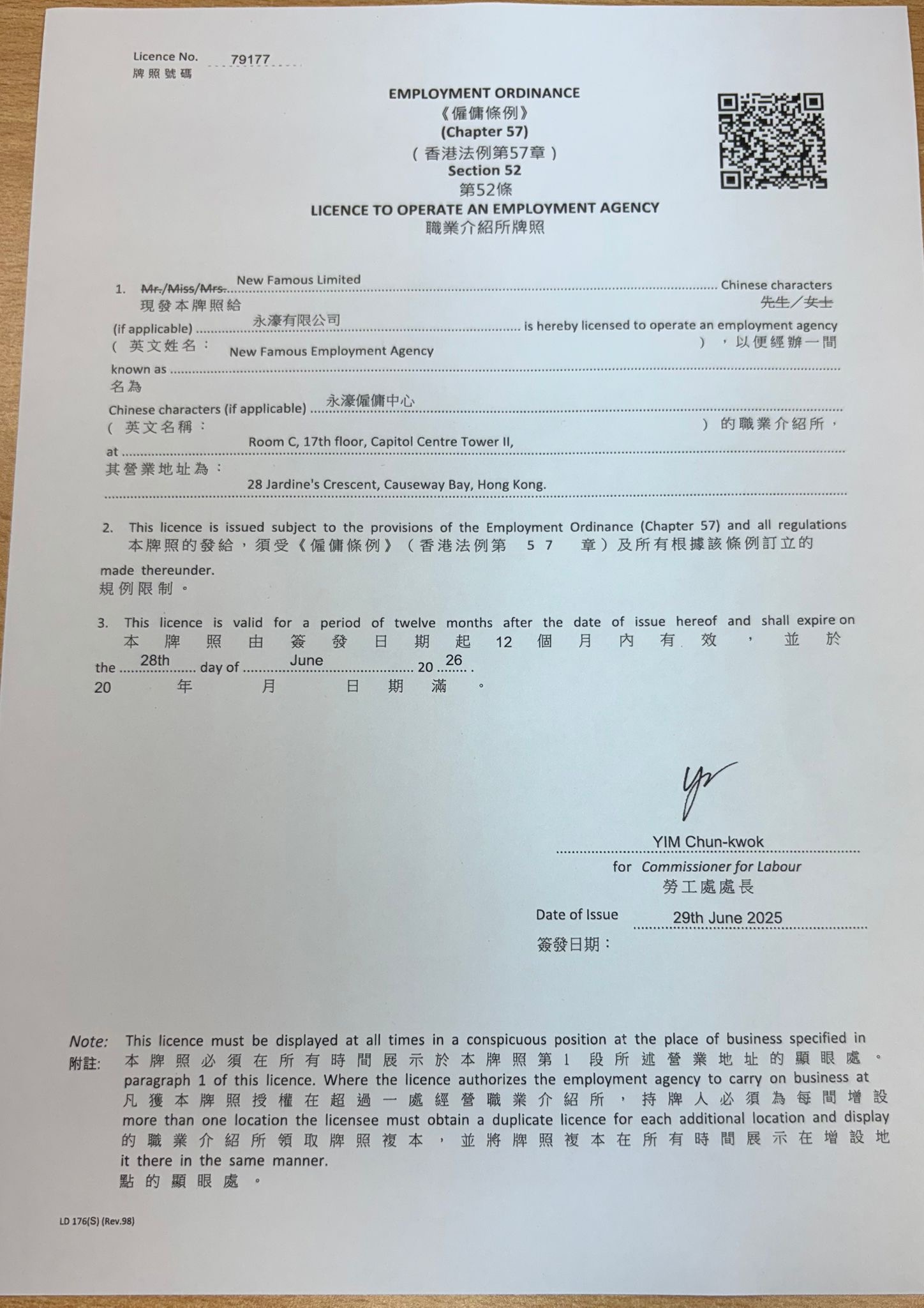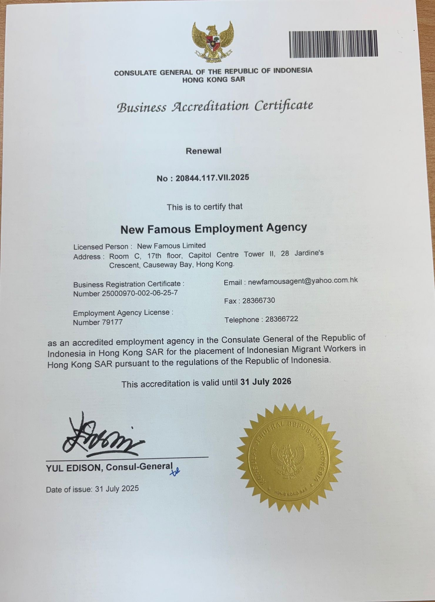 本公司乃是一間專業僱傭公司,已有二十年經驗,信心保證,設立於銅鑼灣,專營印尼優質女傭,為各區家庭服務。本公司直接於印尼培訓中心挑選女傭,港式管理,效率高,申請快。培訓中心設備完善,課程精心編制,獨一無二,為迎合香港家庭需要,我們會到當地面試,為香港僱主精心挑選一些經驗豐富的女傭。嶄新的培訓技巧,提昇傭工潛能,培育一群優秀的專業家務助理。香港牌照號碼#79177 (有效期至 28-6-2026)印尼牌照號碼#20844.117 (有效期至 31-7-2026)